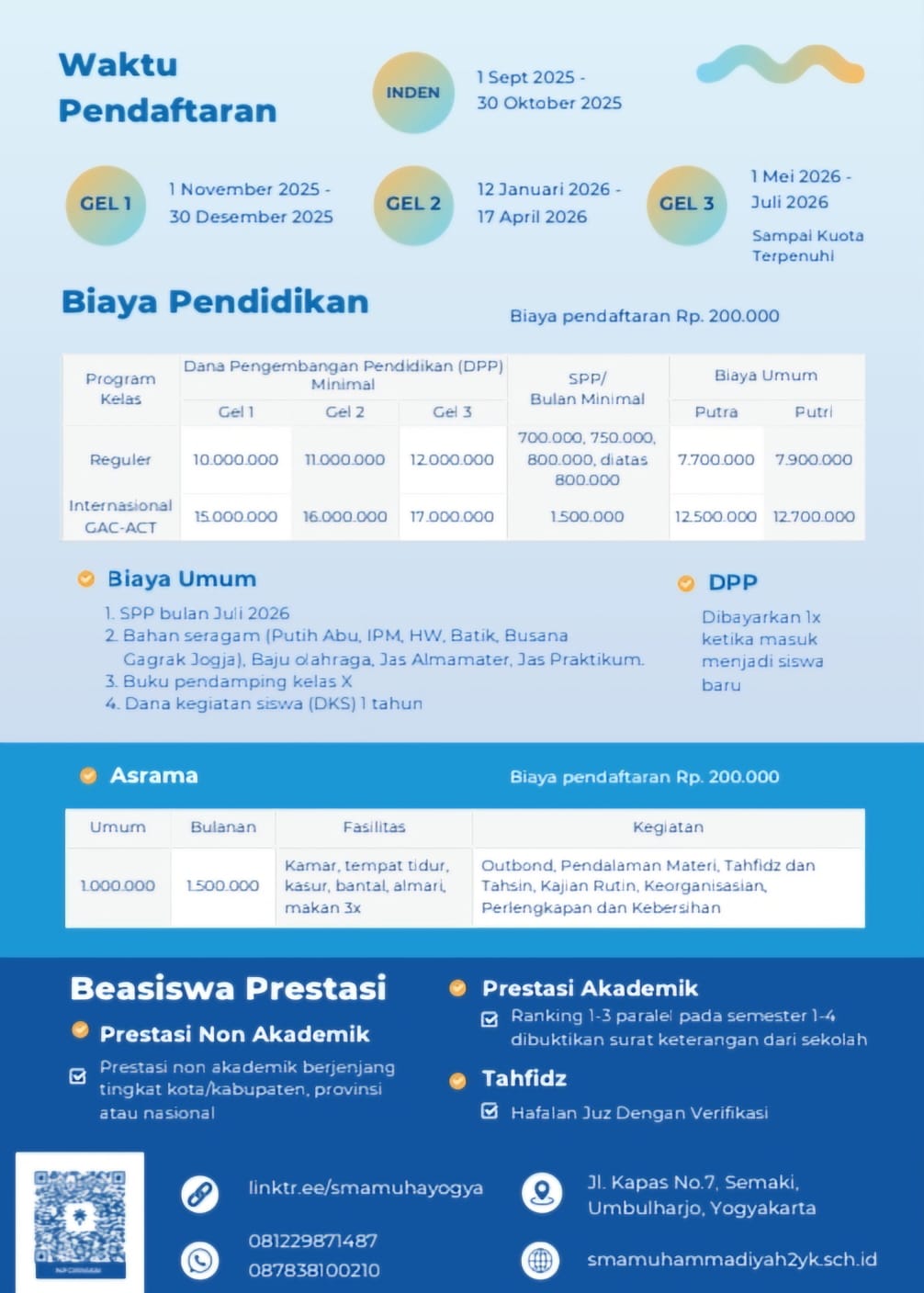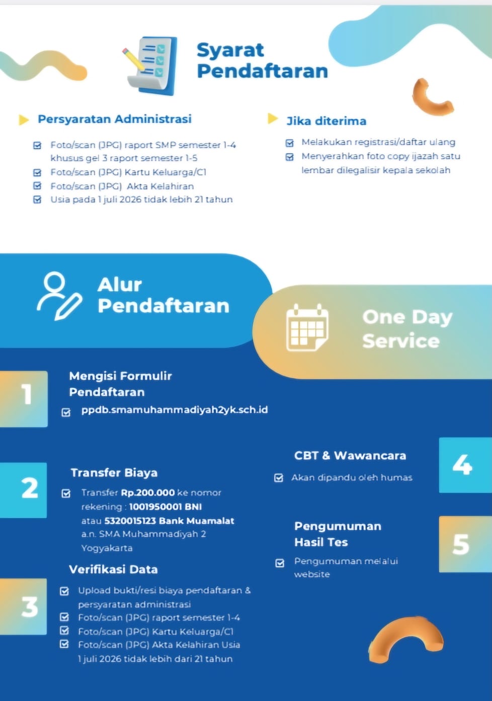 - Melakukan pembayaran/transfer biaya pendaftaran sebesar Rp. 200.000 ke rekening 1001950001 BNI atau 5320015123 Bank Muamalat a.n. SMA Muhammadiyah 2 Yogyakarta